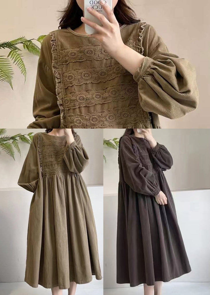Robe longue de printemps brodée en velours côtelé kaki brodée