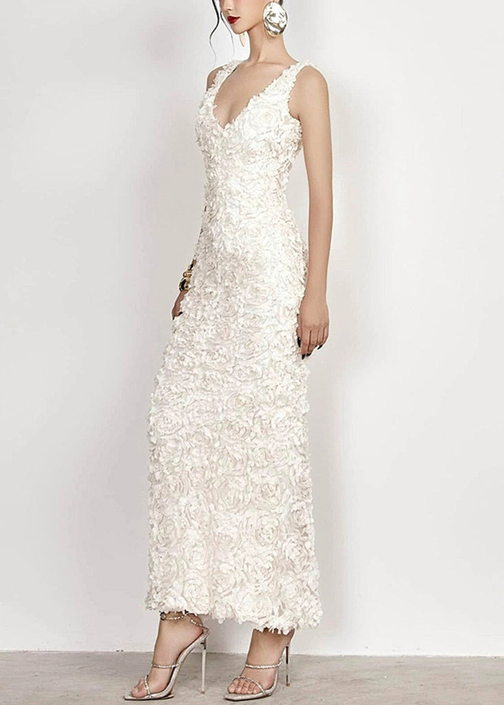 Robe longue en coton blanc faite main, col V, ouverture latérale, sans manches