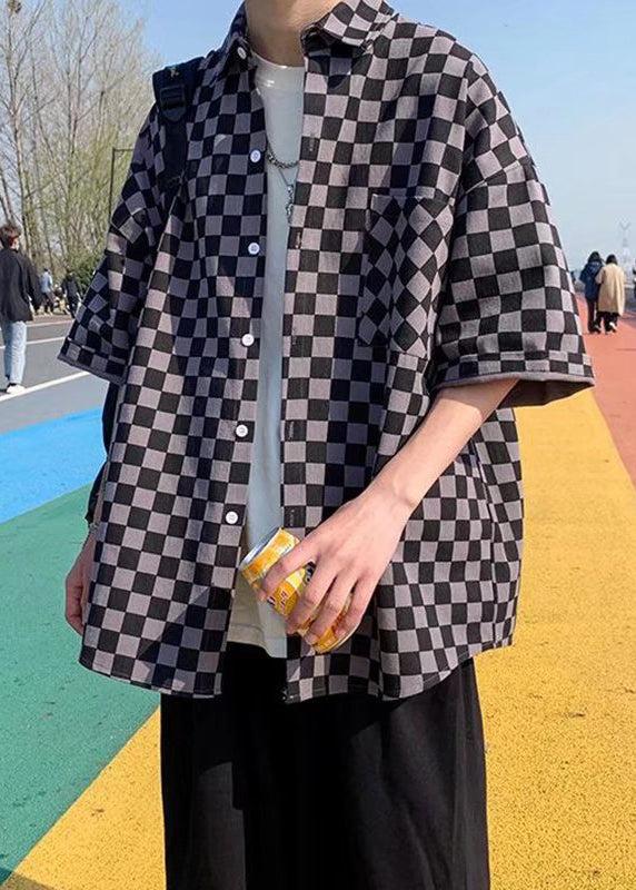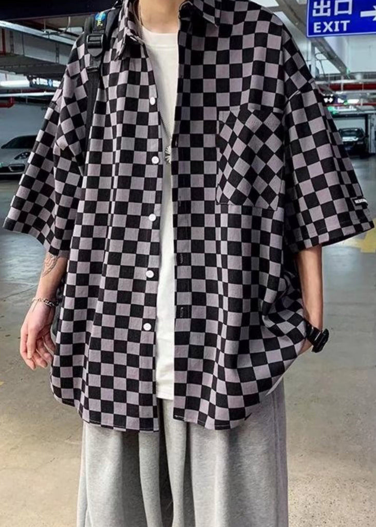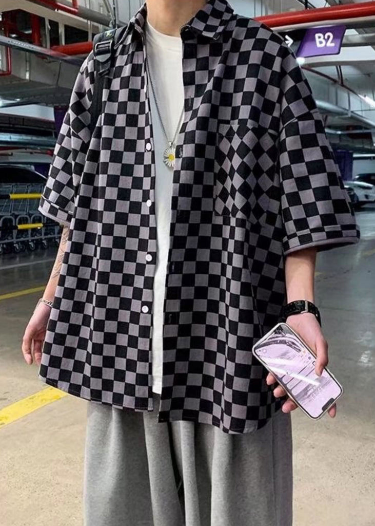 Half Plaid Men Peter Cotton Button Black Collar Shirts Pan Sleeve FashionChic
