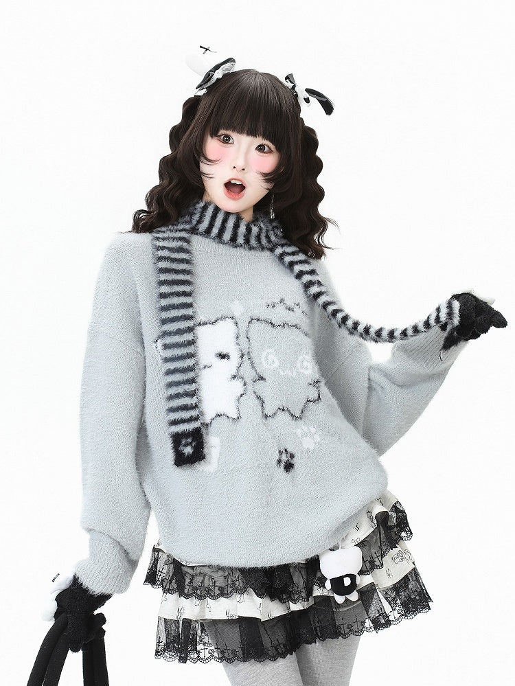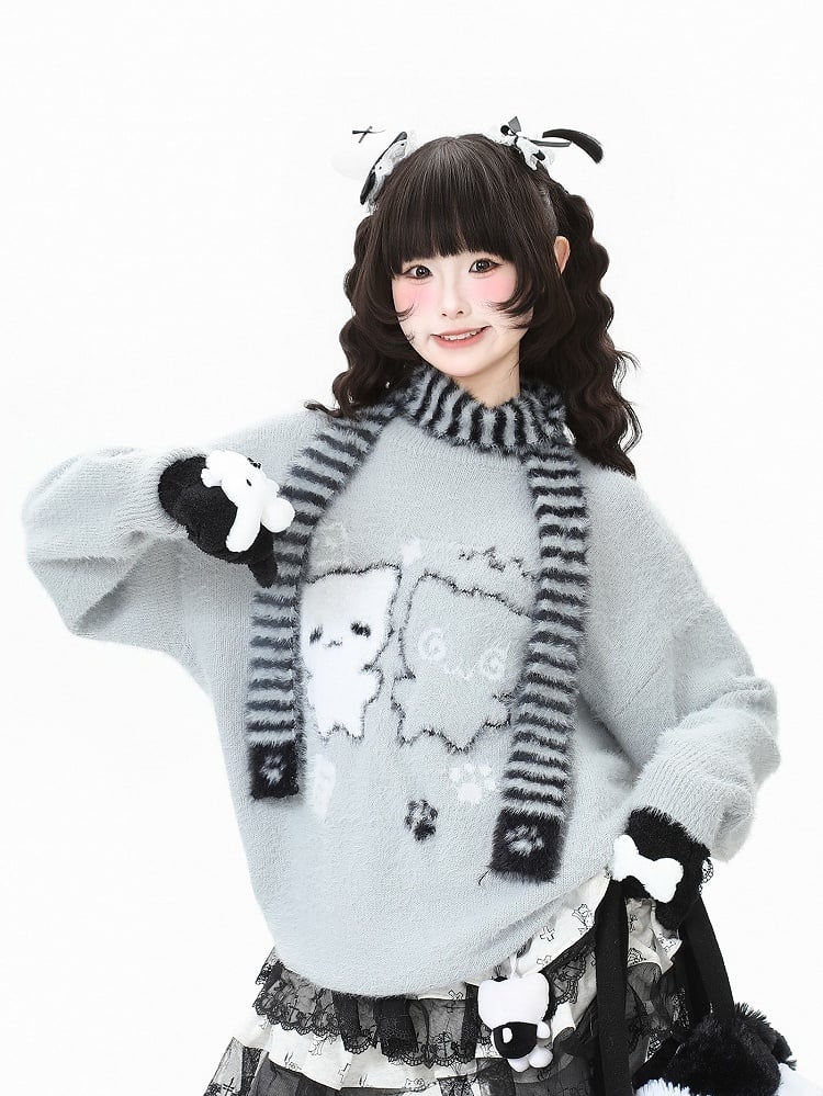 Daily Kawaii Cat Pattern Sweater in Grey/Black with Striped Scarf Set