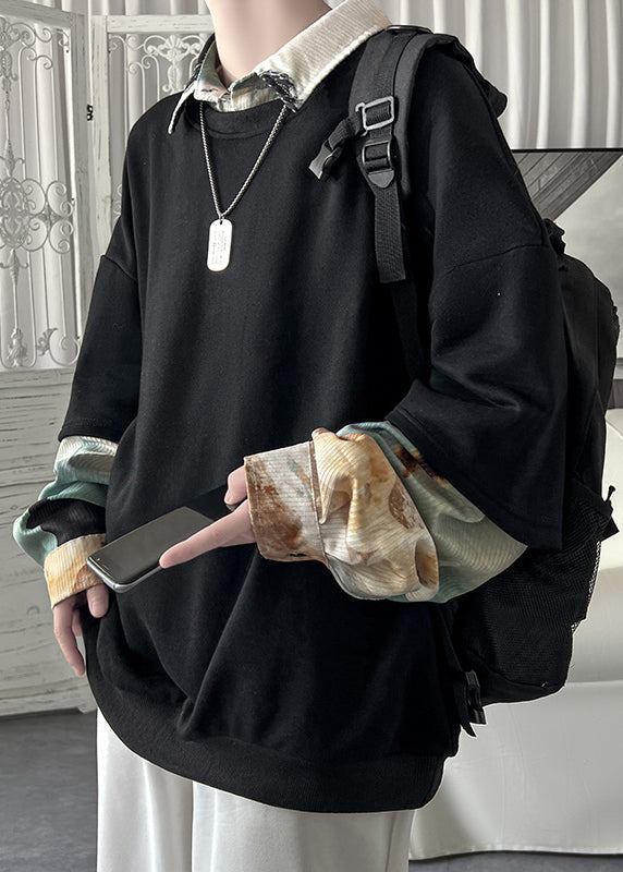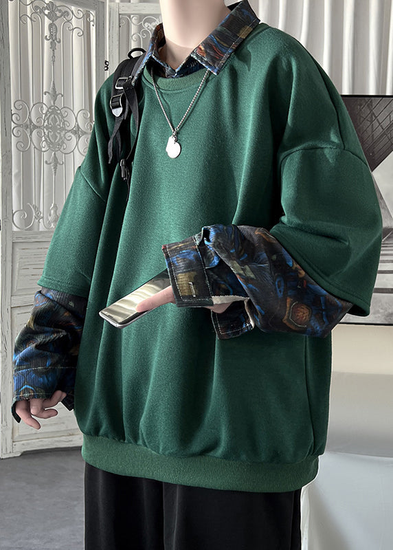 Sweat-shirt homme en coton, coupe ample, vert foncé, col Claudine, patchwork, deux pièces, printemps
