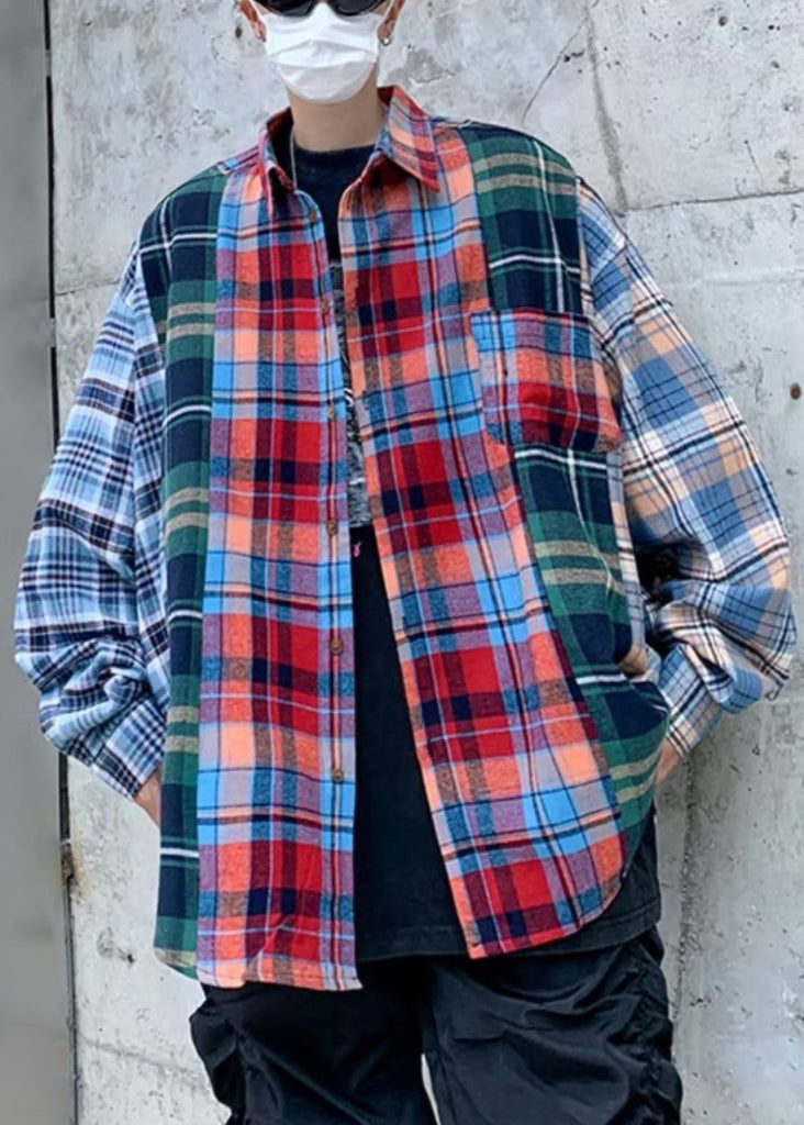 Chemises homme uniques en coton patchwork à carreaux et col Peter Pan, printemps