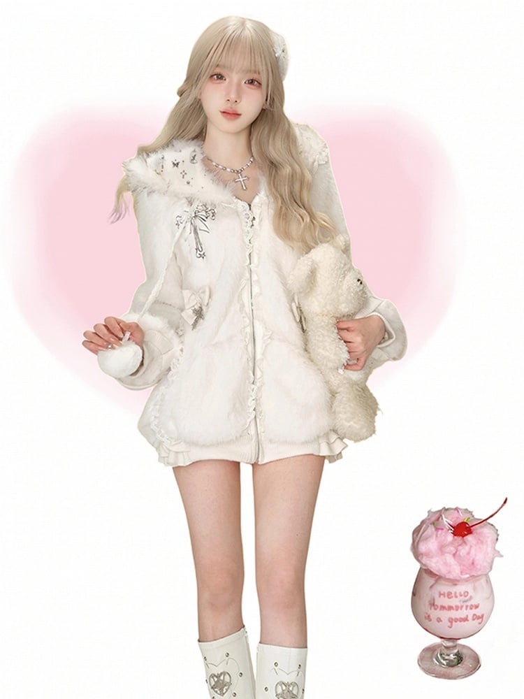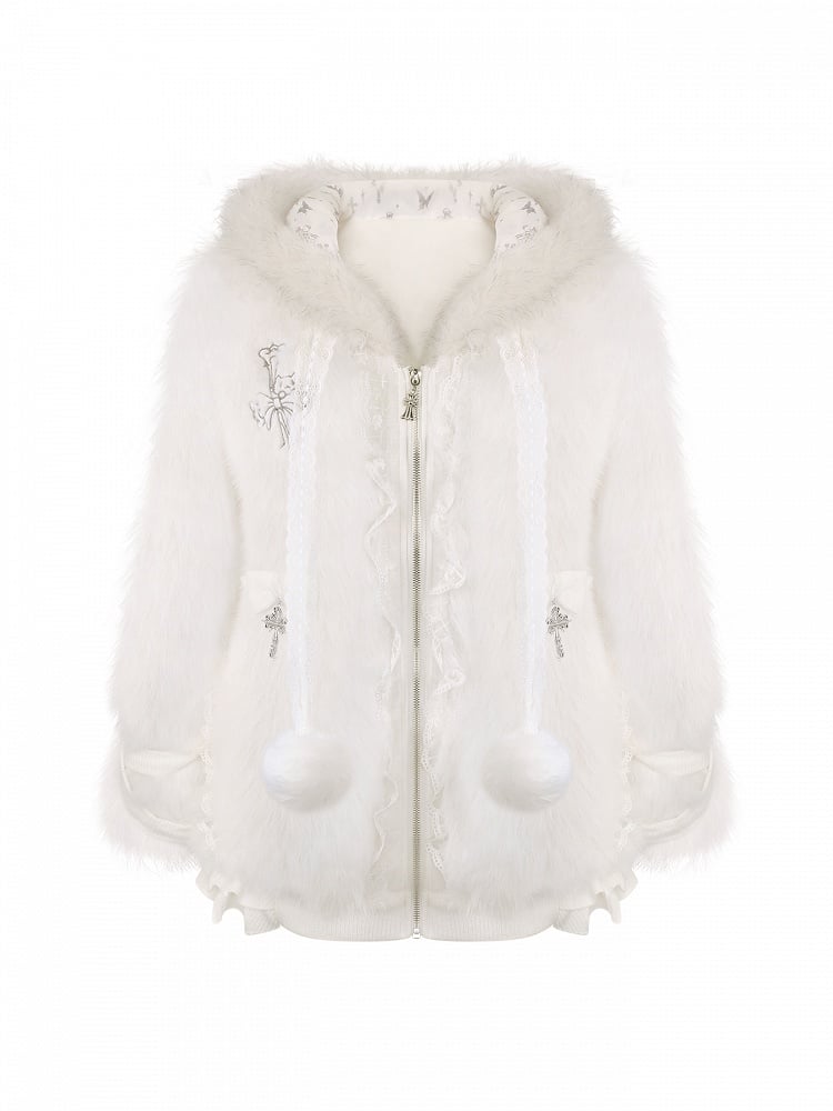 Thicken Version Daily Kawaii Plush Hooded Jacket - Cat Ear Hood, Lace Trim & Cross Accents with Bow Details
