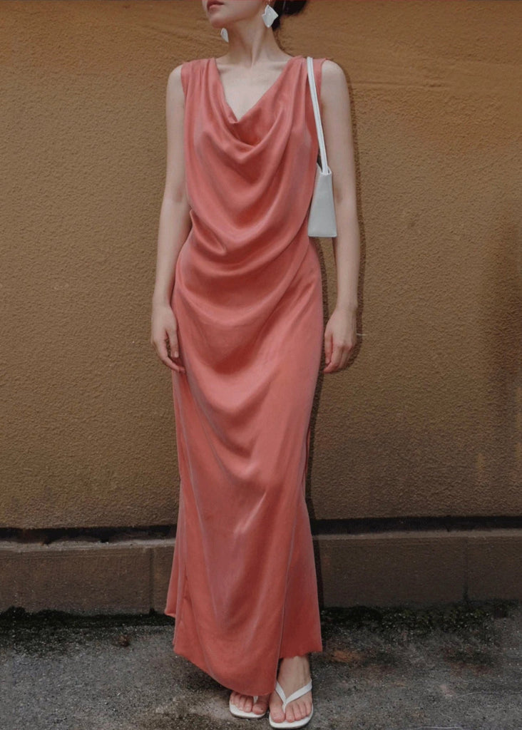 Robe longue sans manches en soie unie orange à lacets pour femme