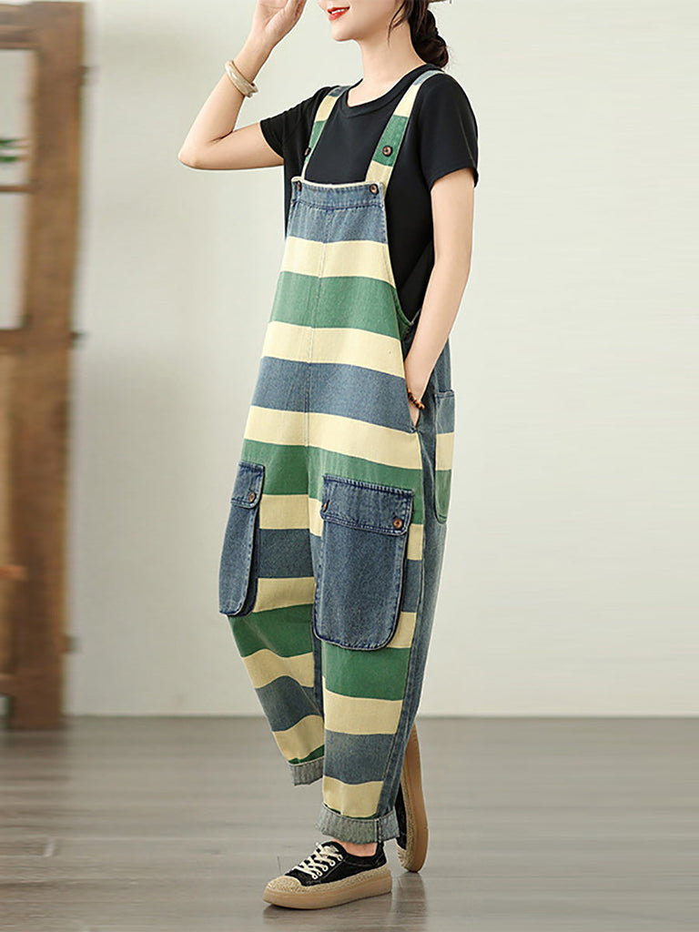 Combinaisons en jean rayées colorblock pour femmes, style ample, été