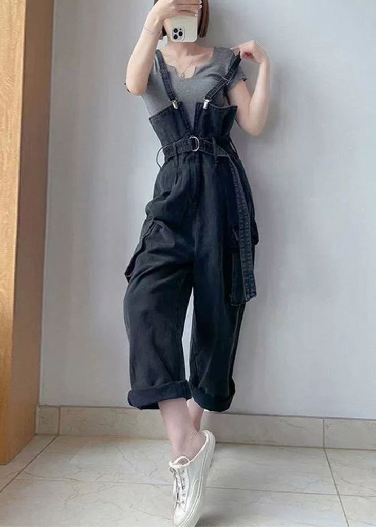 Combinaison salopette en jean noire style bohème avec poches, idéale pour l'été