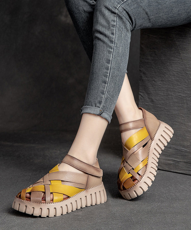 Sandales compensées confortables ajourées en cuir de vachette jaune DD1050
