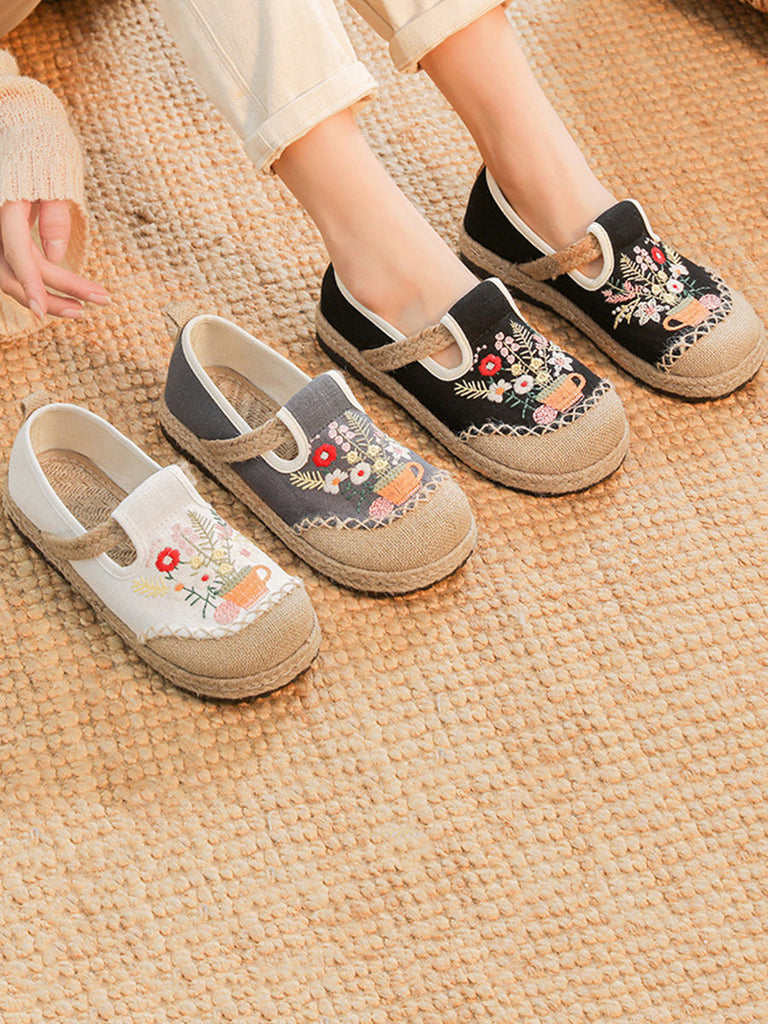 Chaussures d'été pour femmes en lin et coton brodées de fleurs artistiques AT1080