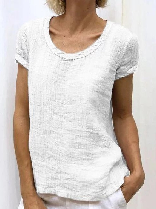 Tops Type: Cotton Linen Shirts, Shirt, Blouse, Fabric: 100% Cotton, Gender: Women's, Occasion: Casual, Style: Basic, Fit Type: Regular Fit, Neckline: Round Neck, Sleeve Length: Short Sleeve, Elasticity: Micro-elastic, Look After Me: Wet and Dry Cleaning, Washable, Machine wash, Top Length: Regular Tops, Pattern: Plain, Season: Summer, Fall, Spring,