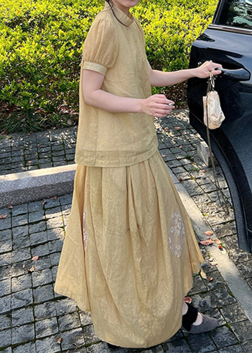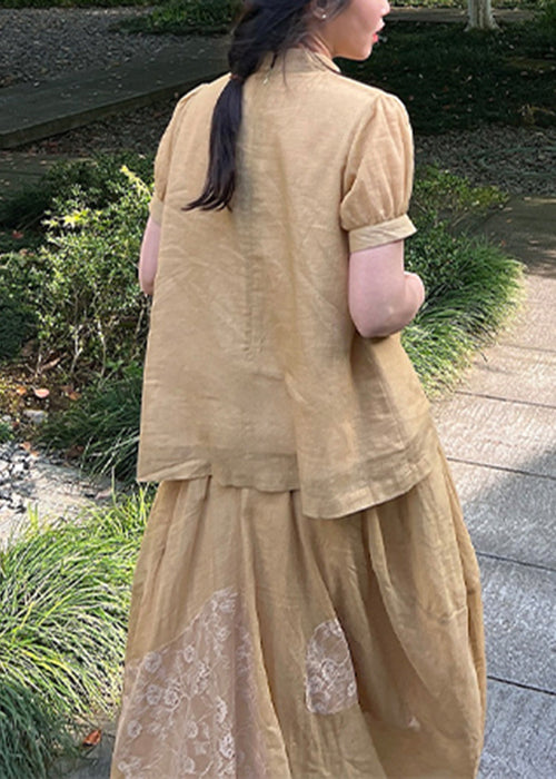 Ensemble deux pièces d'été en patchwork de dentelle jaune artistique : haut et jupe