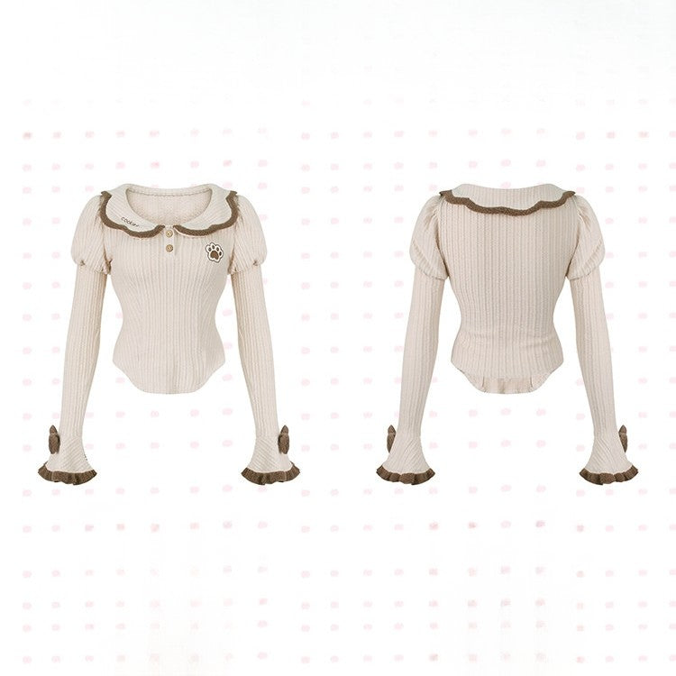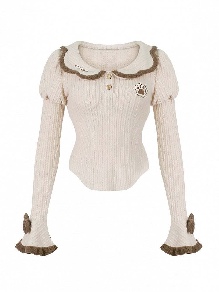 Light Brown Knit Long Sleeves Top with Juliette Sleeves and Adorable Bear Paw Pattern with Bow Details