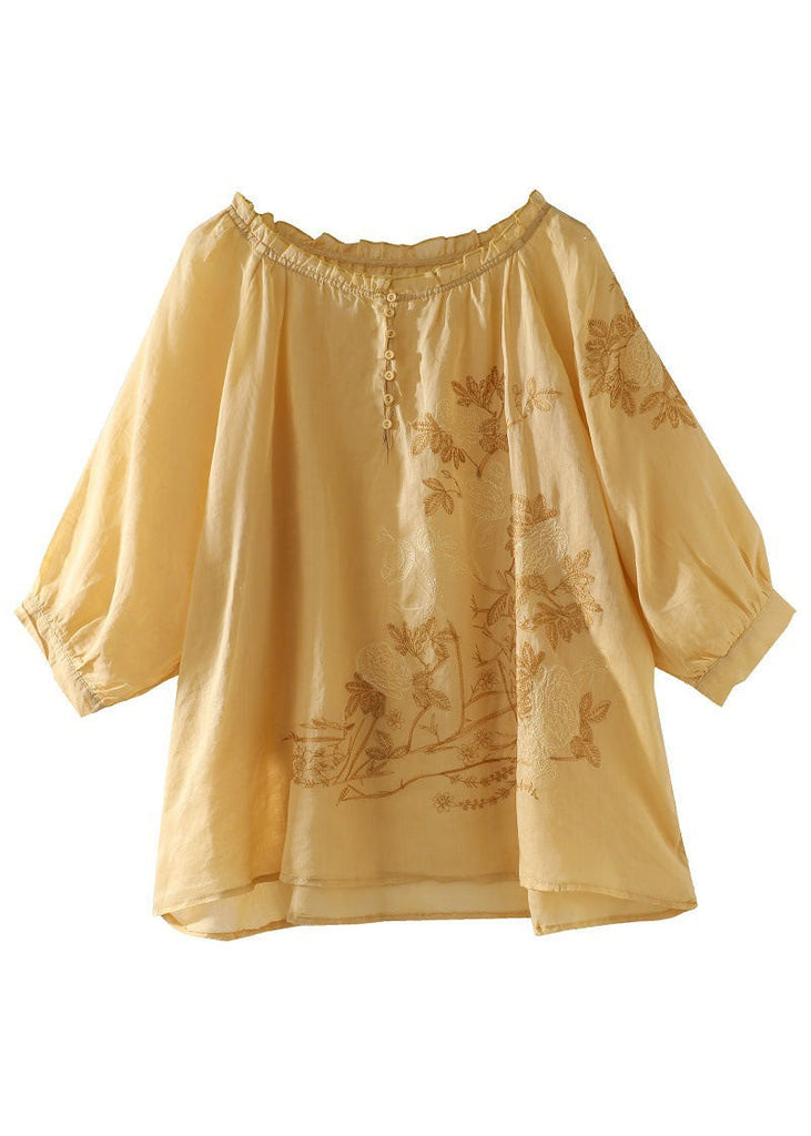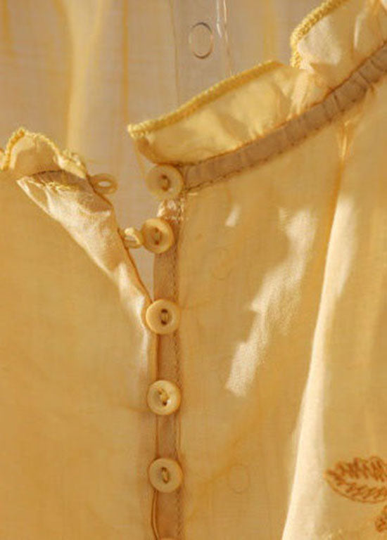 T-shirt élégant jaune à volants et patchwork en lin, idéal pour l'été (LY0615)