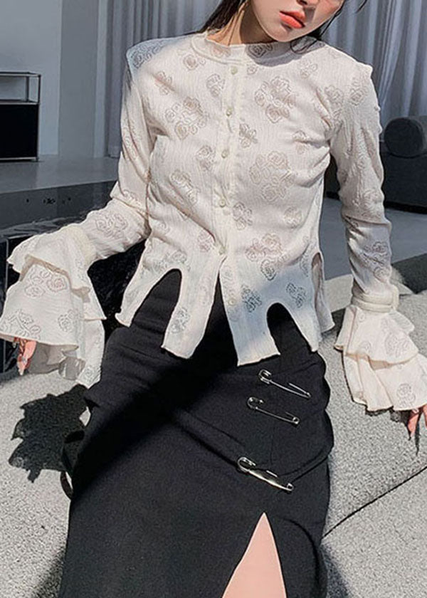 Top asymétrique en coton blanc imprimé, manches évasées, référence LY0760