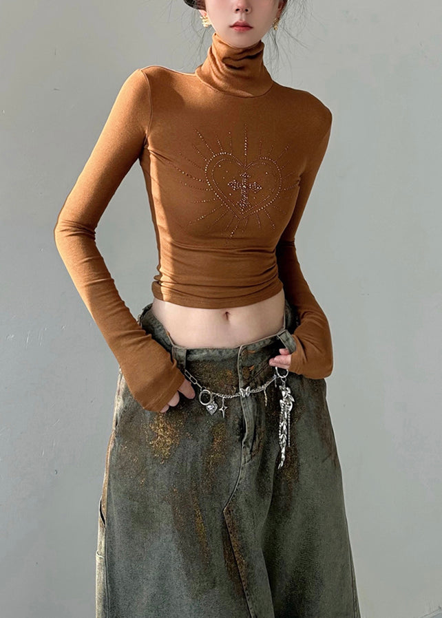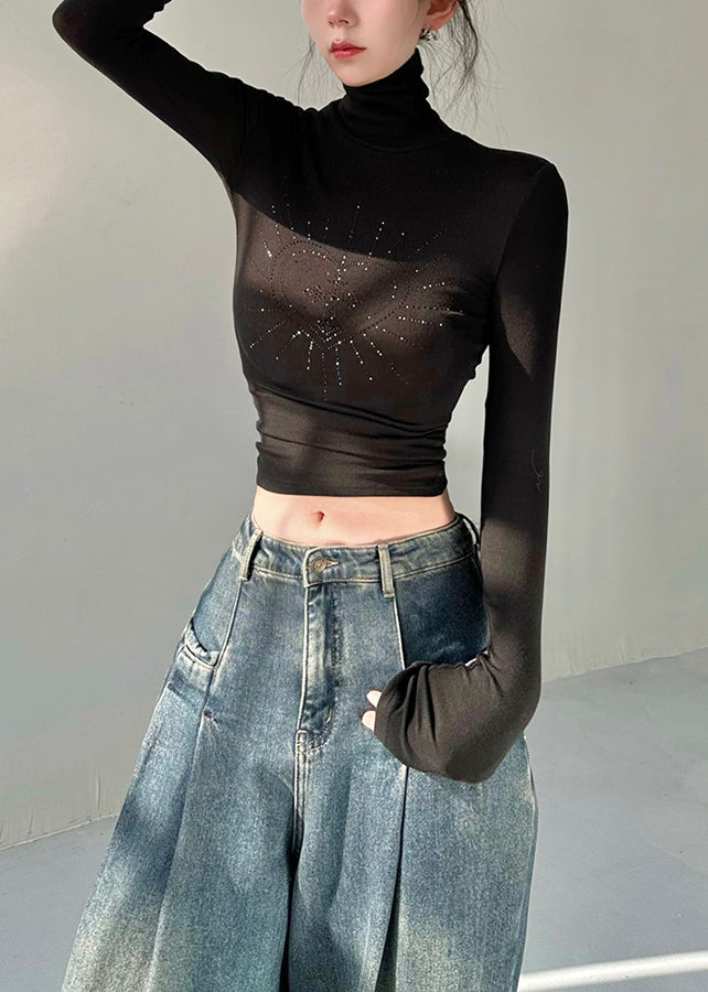 T-shirt en coton blanc à col montant et zircon, style français, automne AL1058