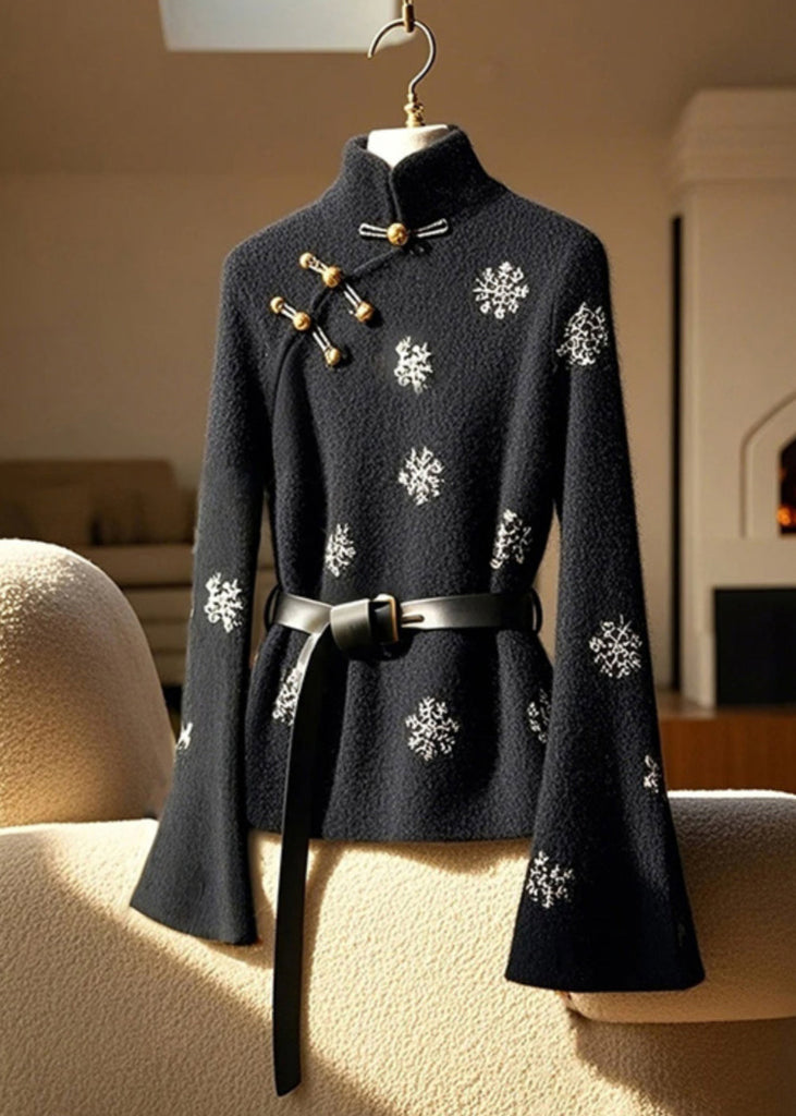 Nouveau haut en coton imprimé à col montant noir et manches évasées TY006