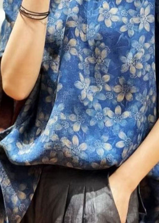 New Blue Stand Collar Button Print Top Half Sleeve QE049 MZF-HTP240927