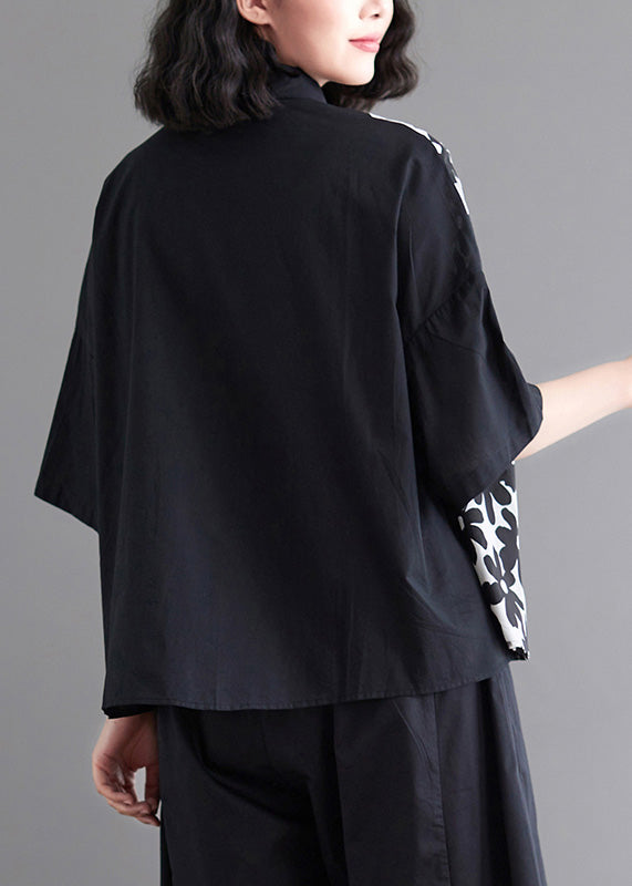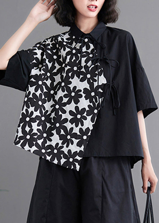 Chemise noire patchwork à nouer à la taille, manches courtes LY0663