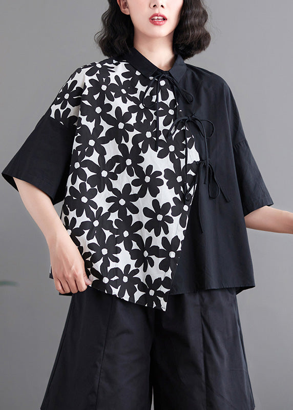 Chemise noire patchwork à nouer à la taille, manches courtes