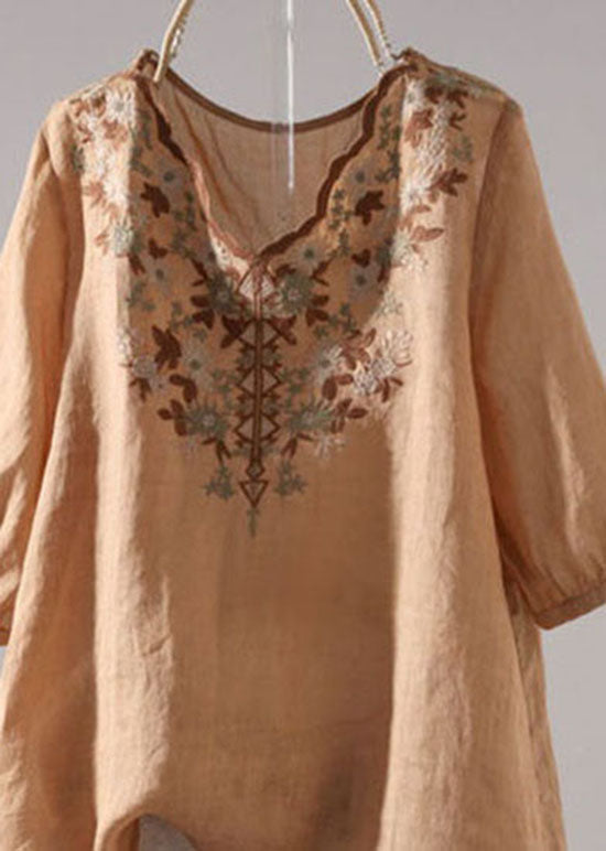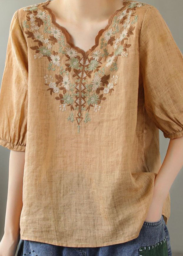 The T-shirt bohème kaki à col en V en lin patchwork brodé, été LY0620 destined to impress, and priced at only $39.00, for a limited time.