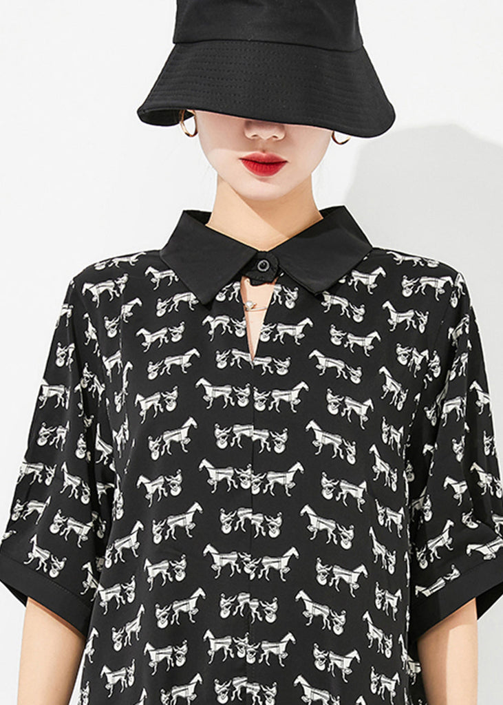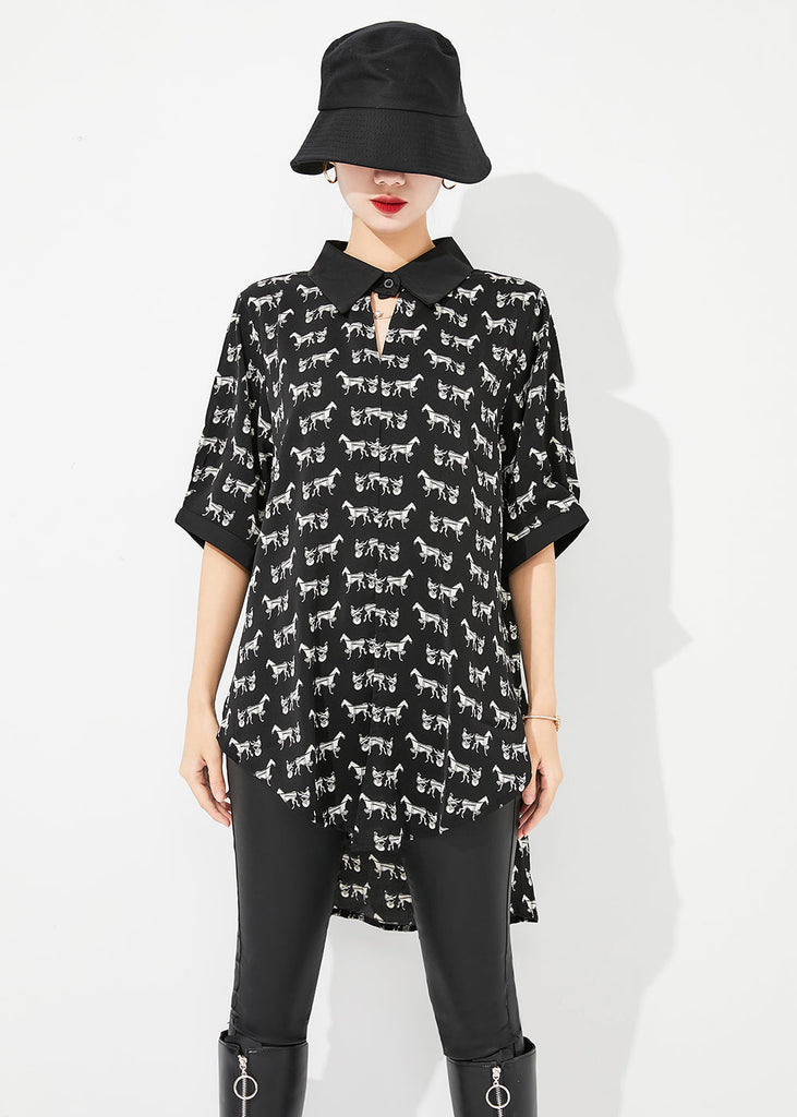 Chemise longue en mousseline noire élégante à imprimé oversize, manches courtes, coupe asymétrique LY0824