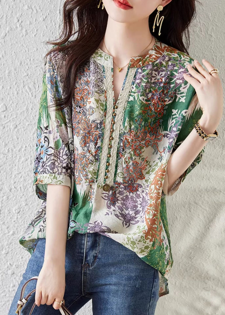 Chemises d'été en mousseline imprimée vert français à col en V TH028