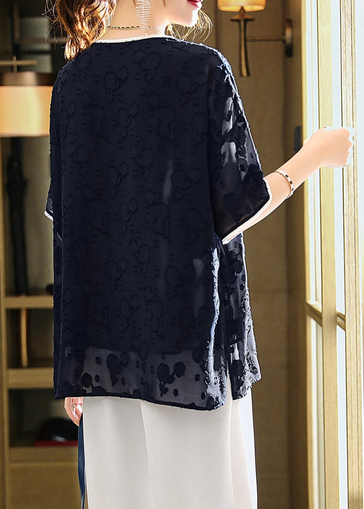 The T-shirt d'été en mousseline patchwork jacquard marine à col en V LY1516 is far and away, one of our most popular items. People can't seem to get enough of it.