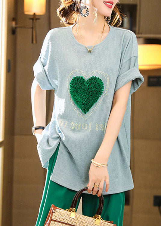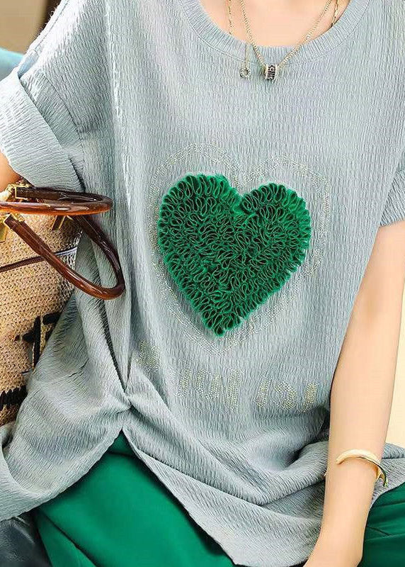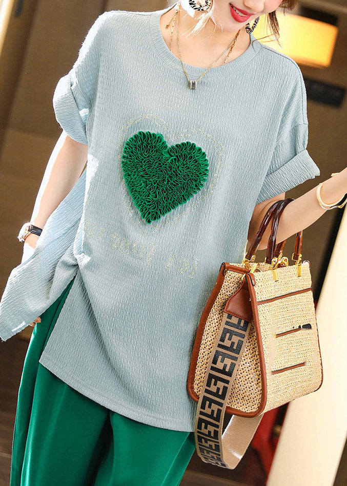 T-shirts bleus simples à col rond avec motif cœur pour l'été