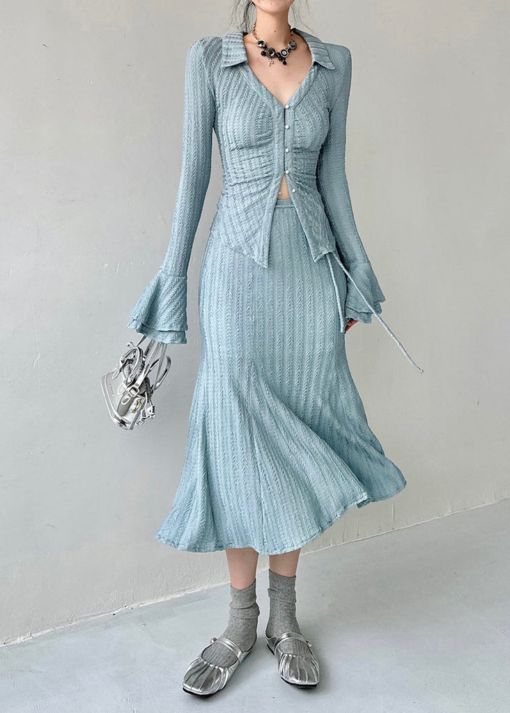 Ensemble deux pièces bleu tricoté, manches évasées, design original AL1065