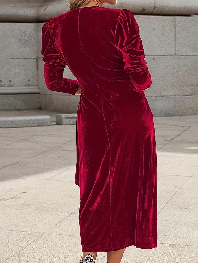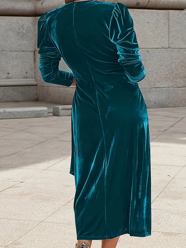 Dresses Type: Party Dress, Christmas Dress, Cocktail Dress, Velvet Dress, Fabric: Spandex, Polyester, Gender: Women's, Design: Wrap, Ruched, Occasion: Party, Evening Party, Date, Style: Elegant, Modern, Fashion, Fit Type: Regular Fit, Dress Length Type: Midi Dress, Neckline: Crew Neck, Sleeve Length: Long Sleeve, 3/4 Length Sleeve, Elasticity: Micro-elastic, Look After Me: Hand wash, Pattern: Plain, Season: Winter, Fall,