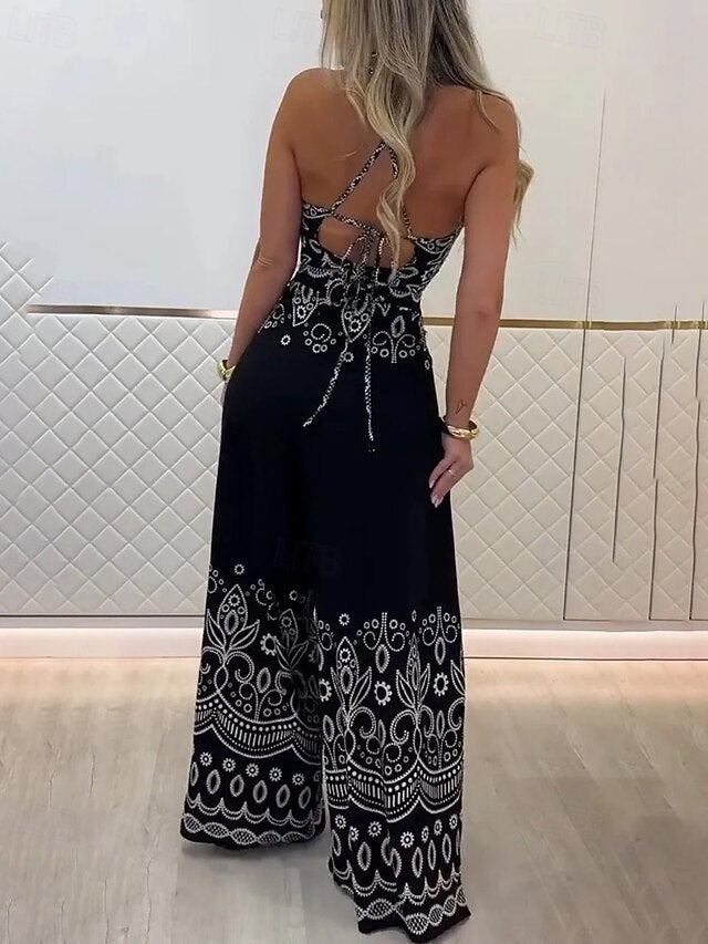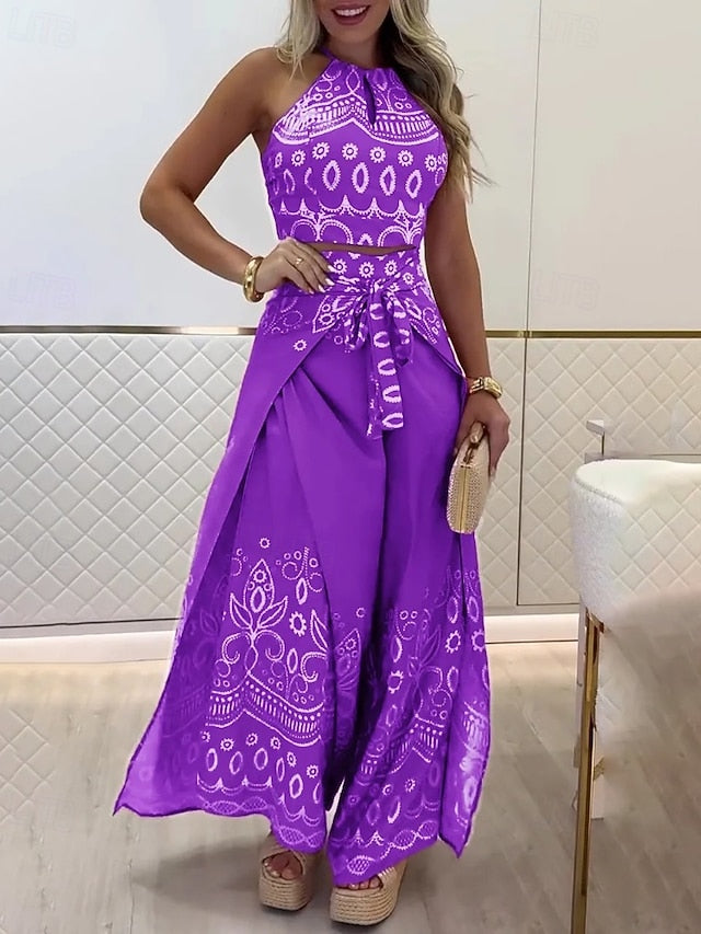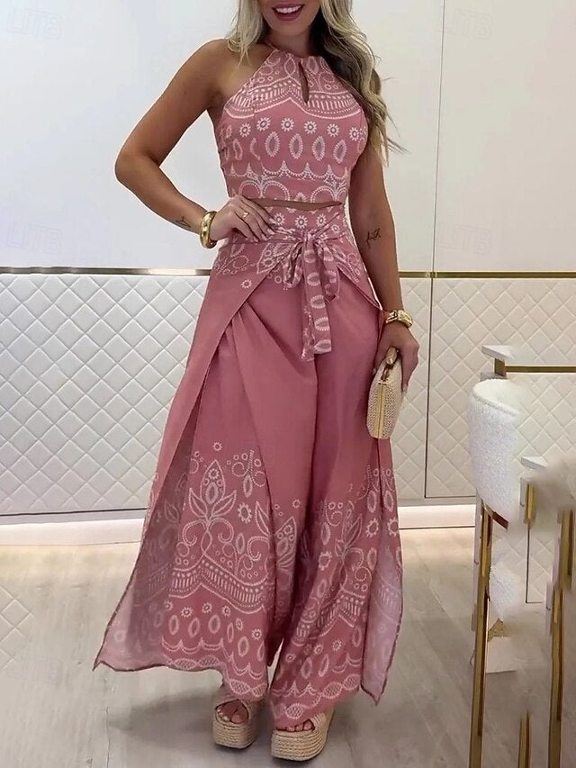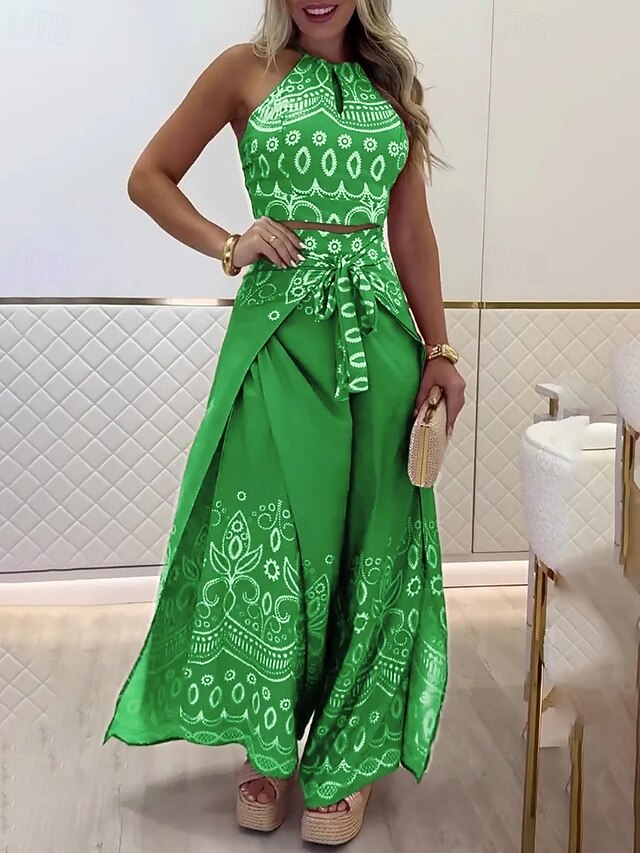 Gender: Women's, Style: Active, Boho, Occasion: Vacation, Weekend, Tops Type: Blouse, Pants Sets, Neckline: Halter Neck, Fabric: Polyester, Design: Print, Sleeve Length: Sleeveless, Elasticity: Micro-elastic, Pattern: Floral, Season: Summer,