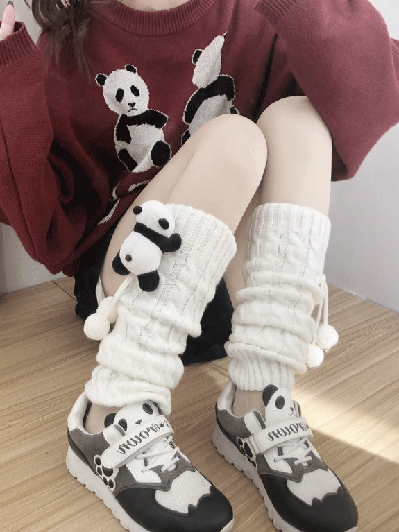 Decorated Cable Leg Warmers Black Pom-Pom Panda White Creamy Brooch + Knit Set /