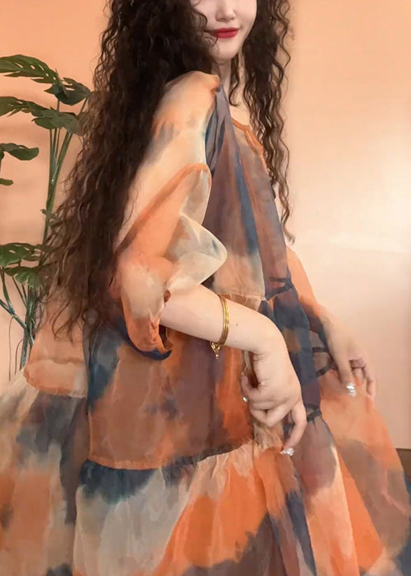 Ensemble deux pièces imprimé en tulle patchwork à manches courtes, motif original orange