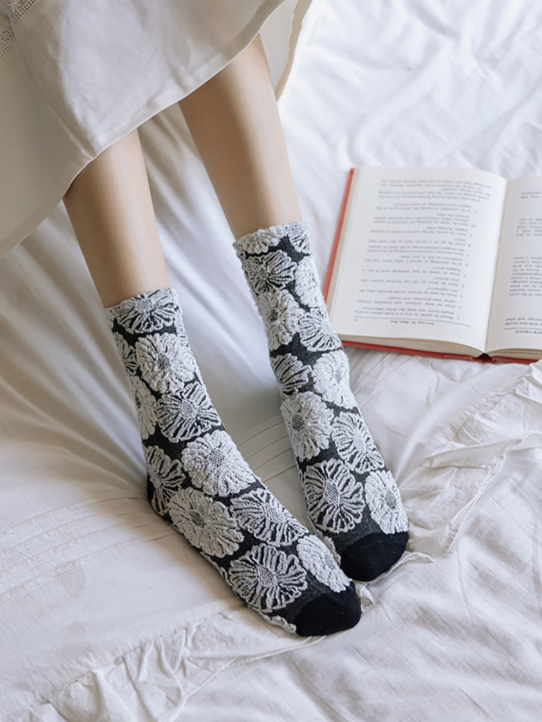 Lot de 3 paires de chaussettes jacquard à fleurs artistiques noires et blanches pour femmes AT1018