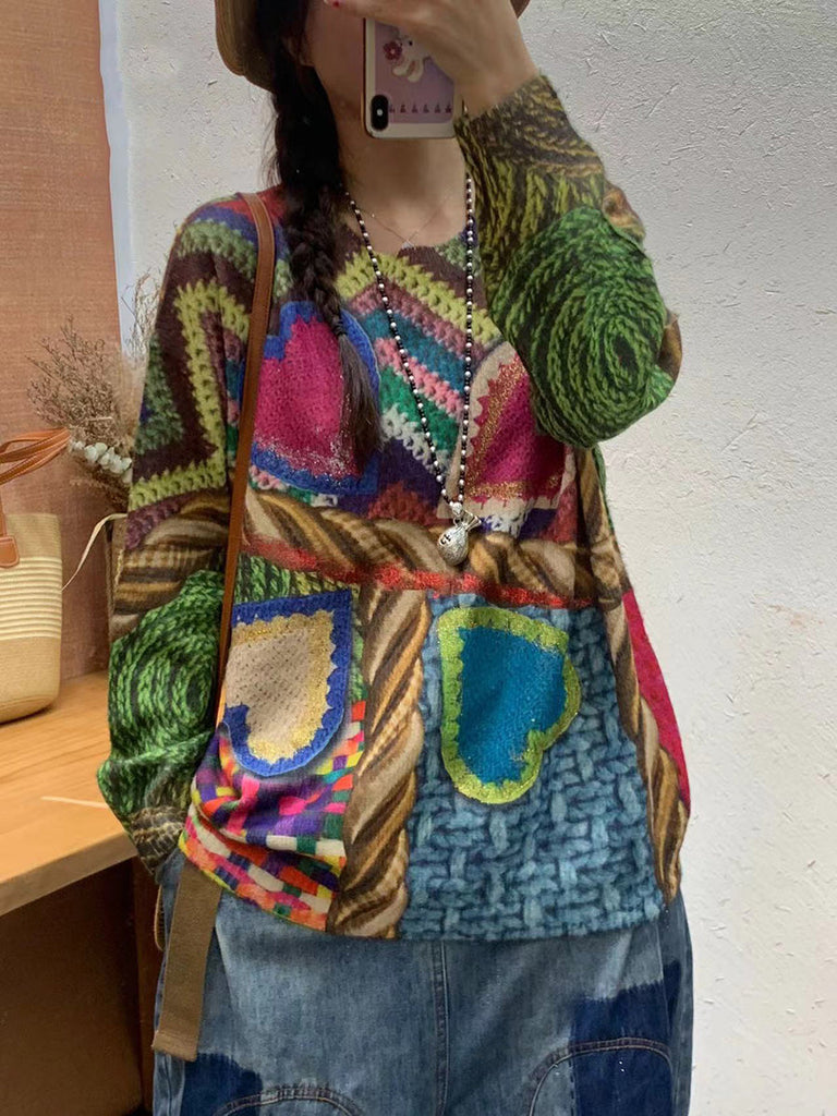 Women Autumn Print O-Neck Knit Sweater AT1083 BUYKUD