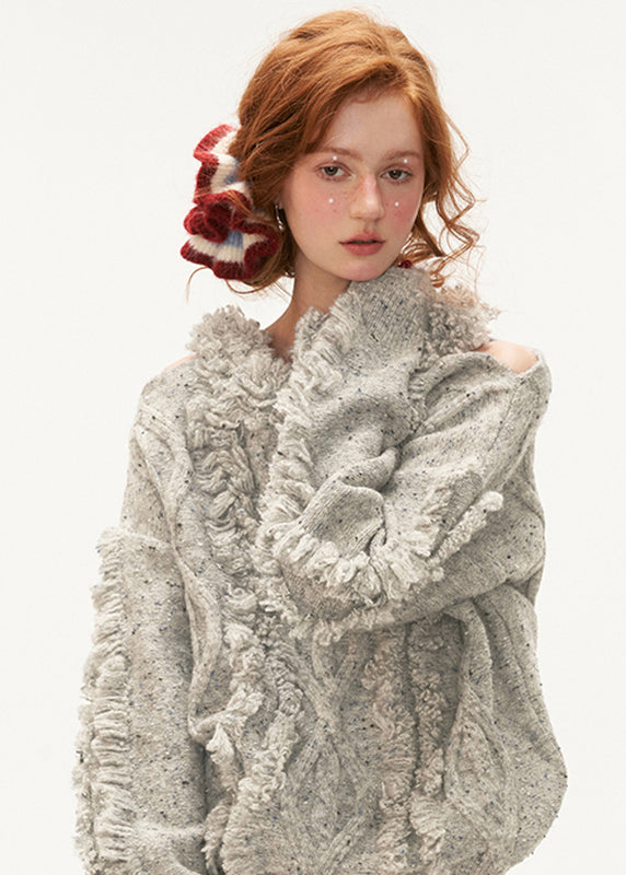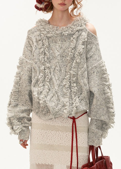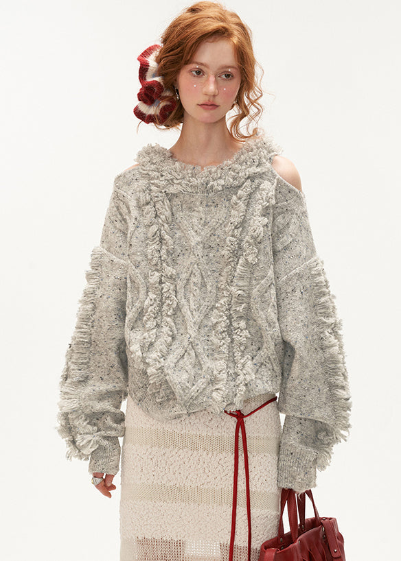 Women Blue Cold Shoulder Tassel Thick Cotton Knit Sweaters Winter QX003 shopify