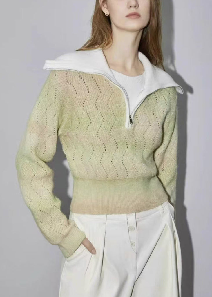 Découvrez l'élégance luxueuse de notre pull en laine tricotée ajourée verte pour femme, idéal pour l'hiver - doté d'une fermeture éclair élégante qui respire le raffinement.