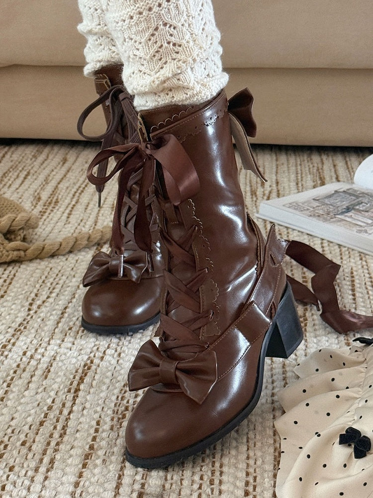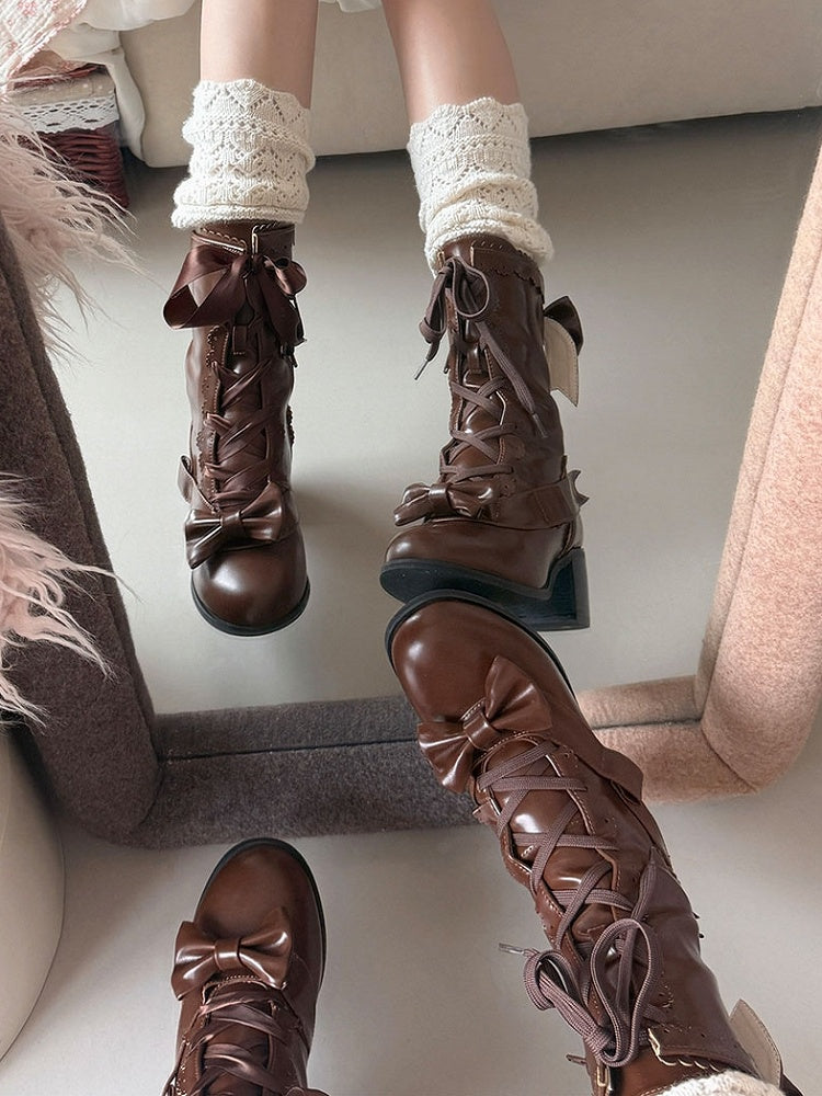 Mid-Calf Lolita Mid-heel Scalloped Brown Edge with Sweet Boots Detail Bow