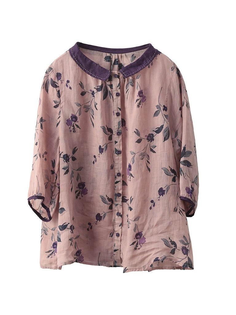 100%Ramie Shirt Summer Turn-down Artsy Collar Flower Women