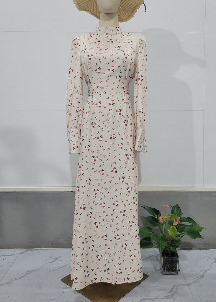 2024 Autumn Apricot Lace Up Stand Collar Print Chiffon Dress WO056