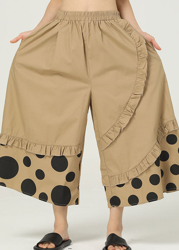 Chic Khaki Ruffled Pockets Print Cotton Wide Leg Pants Summer LY1227