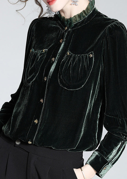 Fitted Blackish Green Stand Collar Button Velour Shirts Long Sleeve