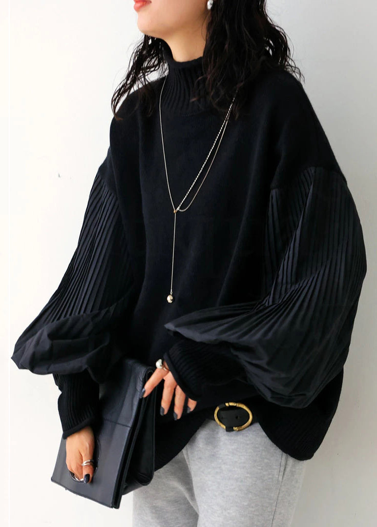 French Green Turtleneck Patchwork Knit Sweater Lantern Sleeve TF012