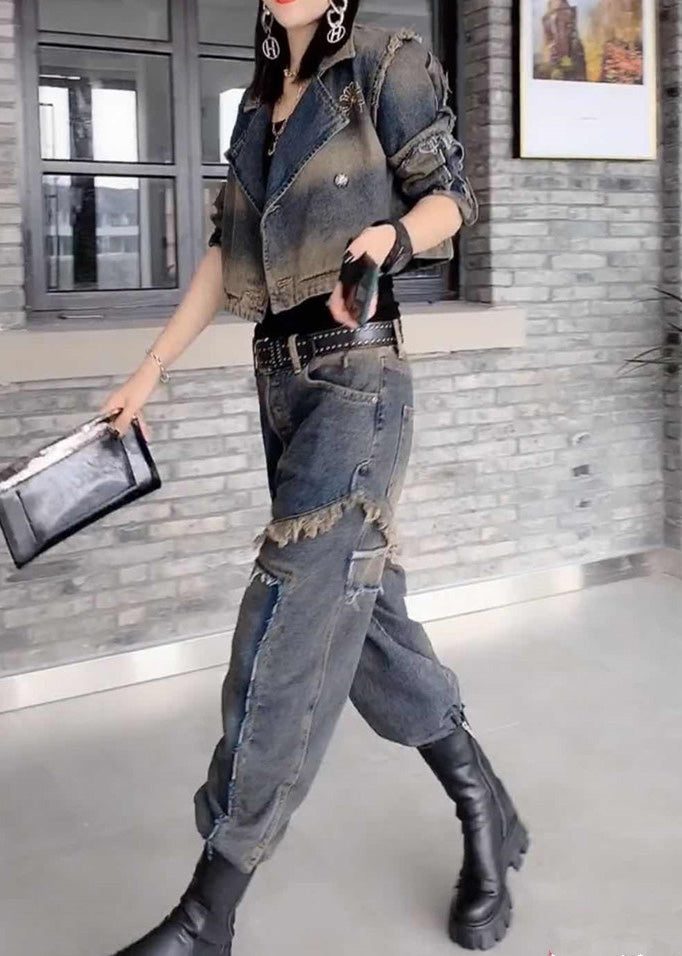 Handmade Grey Peter Pan Collar Patchwork Coats And Jeans Two Pieces Set Fall