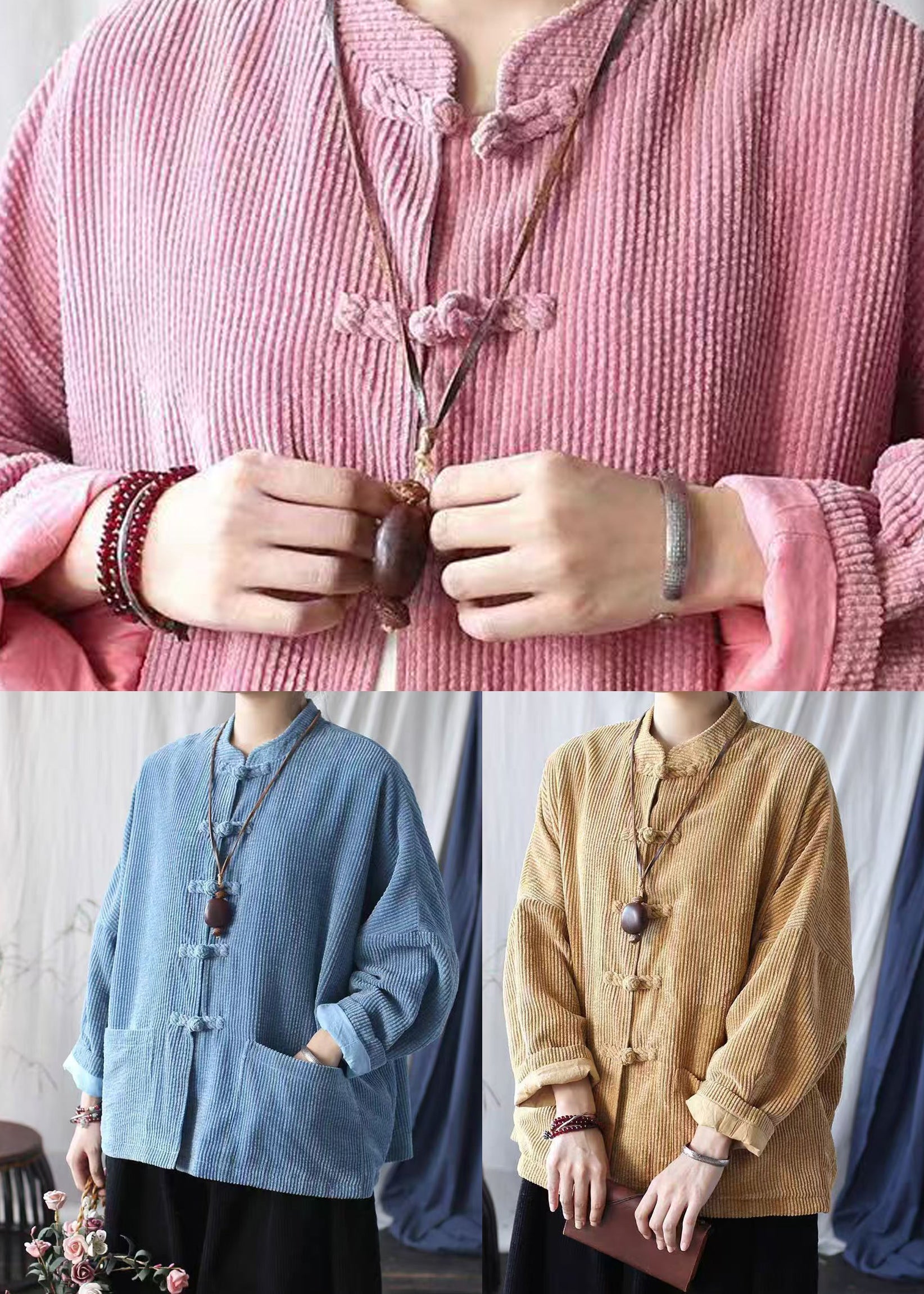 Khaki Pockets Retro Corduroy Coat Oriental Button Spring TJ024