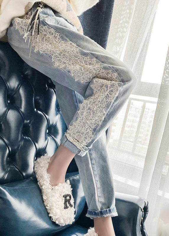 Novelty Light Blue Lace Patchwork Elastic Waist Harem Jeans