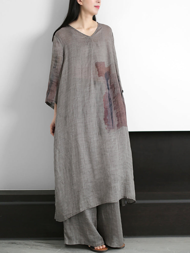 Plus Size Women Vintage Print 100%Ramie Long Shirt+Pants ZZ1056
