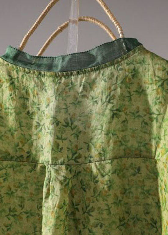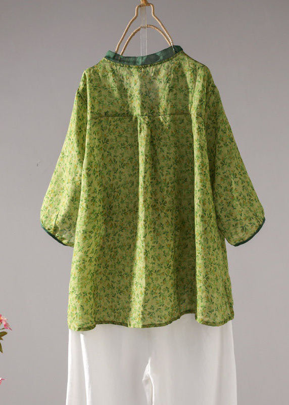 Style Green Stand Collar Print Linen Shirt Top Half Sleeve LY1429