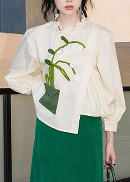 Vintag Beige Ruffled Embroideried Tie Waist Shirts Long Sleeve LY0752
