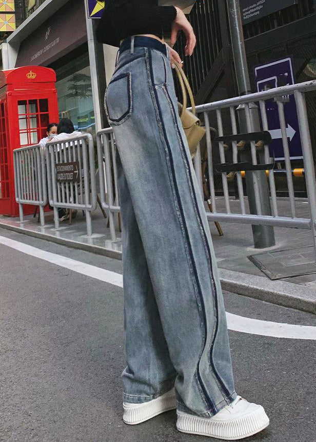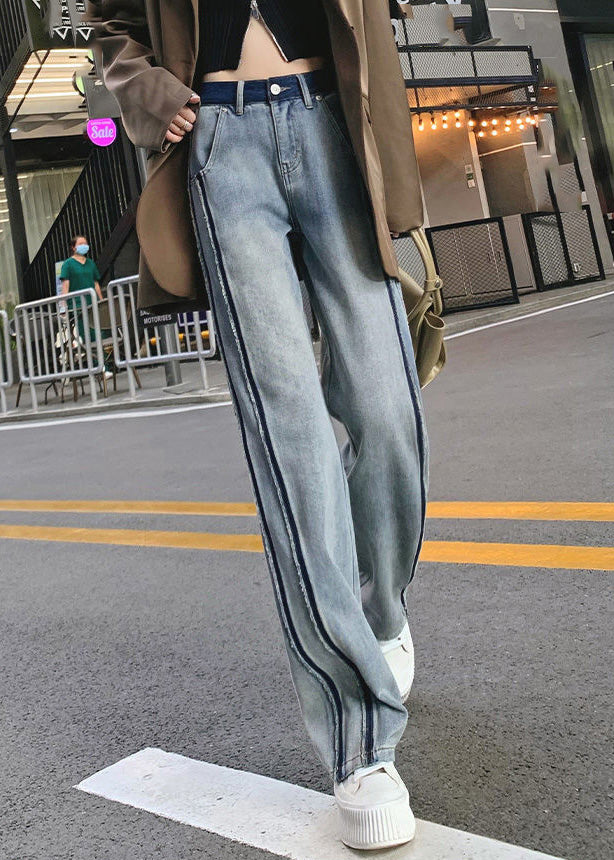 Vintage Blue Patchwork Zippered Button Straight Jeans