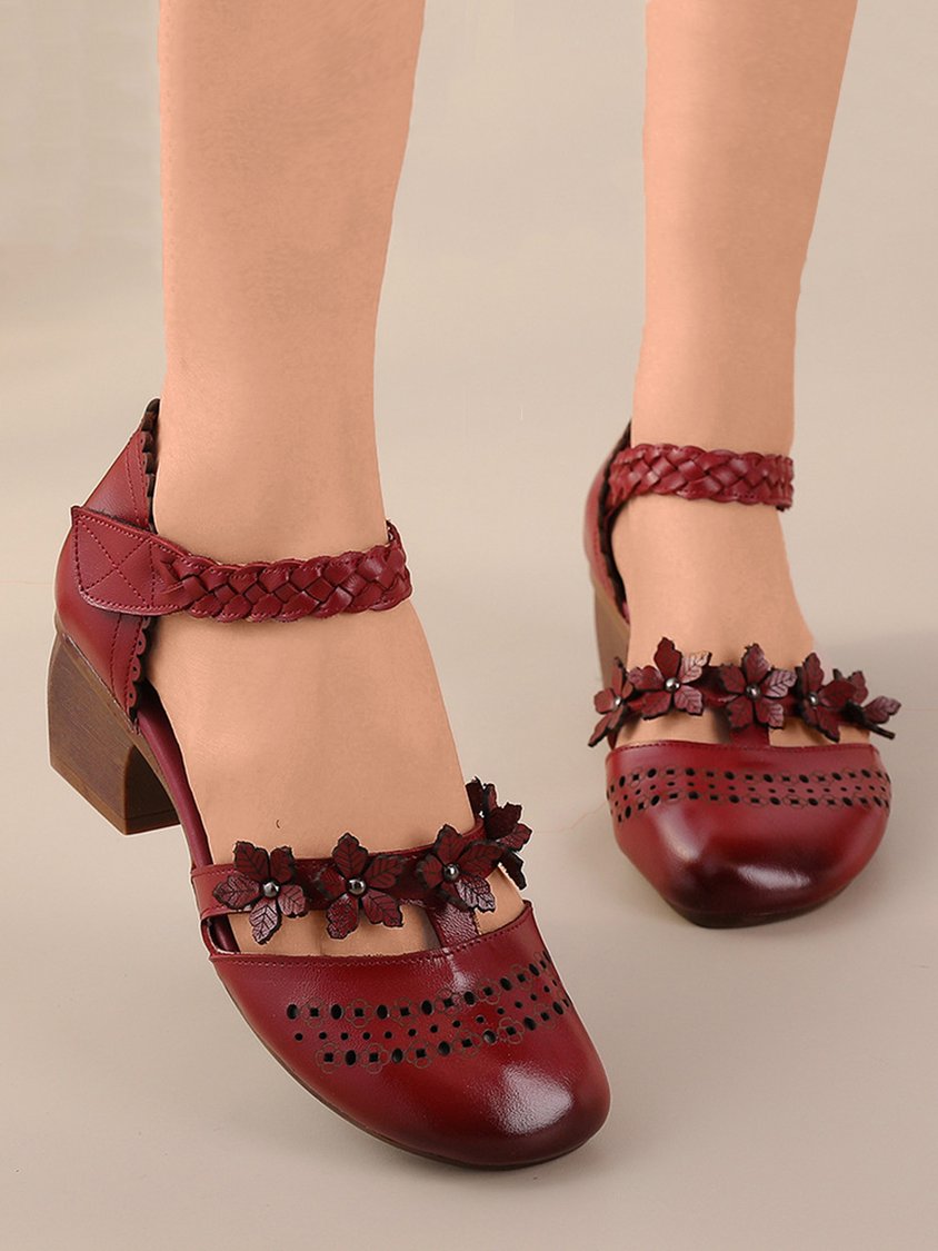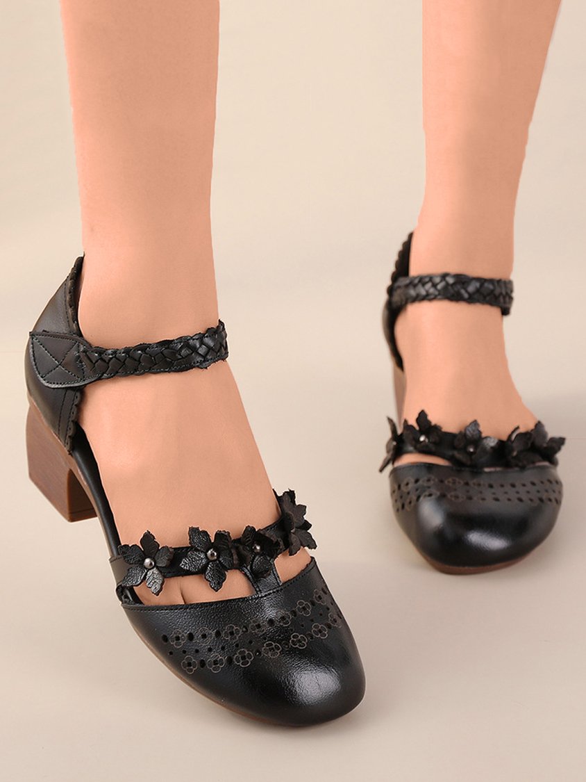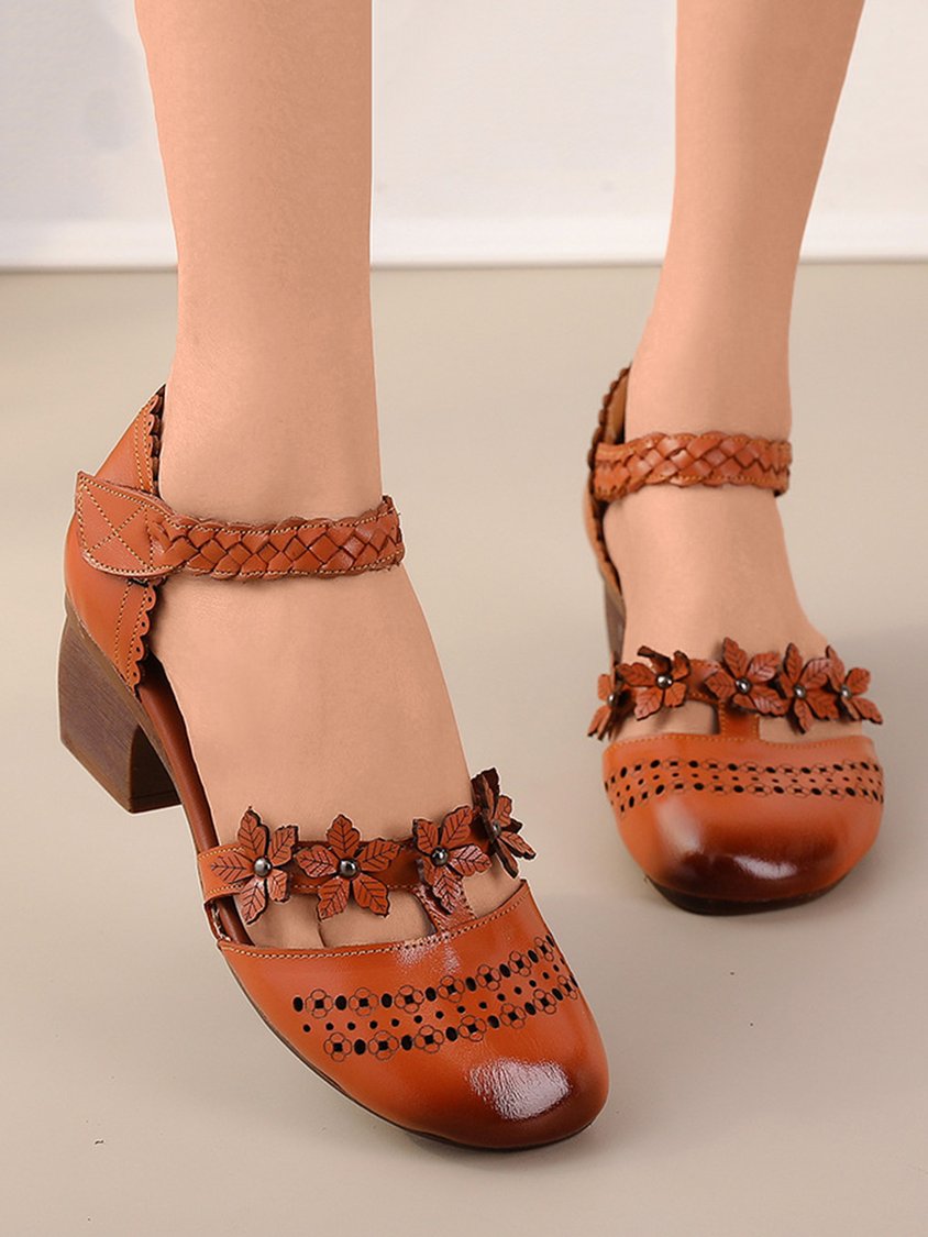 Vintage Applique Decor Braided Block Heel Cowhide Leather Sandals QAF5